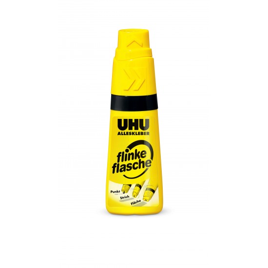 UHU Alleskleber flinke flasche, der bewährte Alleskleber in der weichen, handlichen Flasche mit dem einzigartigen Drehklebekopf für Punkt-, Strich- und Flächenkleben. Der ideale Klebstoff für die universelle Anwendung in Schule, Haushalt und Büro, beim Basteln, Werken etc. Bei 60°C auswaschbar. UHU ALLESKLEBER flinke flasche macht Kleben besonders einfach. Die einzigartige Flasche ist leicht nachfüllbar.