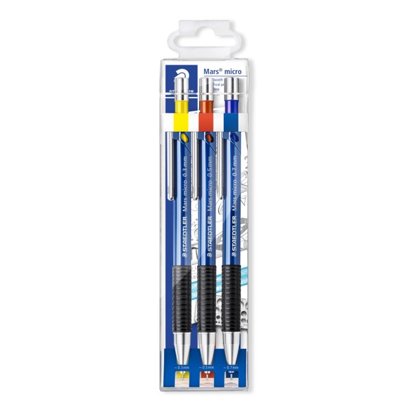 • Druckbleistifte zum Schreiben und Zeichnen • ISO - Farbcode • Rutschfeste Gummigriffzone • Clip, Drücker und Spitze aus Metall • Taschensicher aufgrund versenkbarem Metall - Minenröhrchen • Starres, zylindrisches Minenröhrchen, ideal für Lineale und Schablonen • Bruchgeschützt durch federnd gelagerte Mine • PVC - und latexfreier Radierer • Einfaches Nachfüllen durch "12 auf einen Streich" mit Mars micro Carbon 250 Feinminen • B - Minen